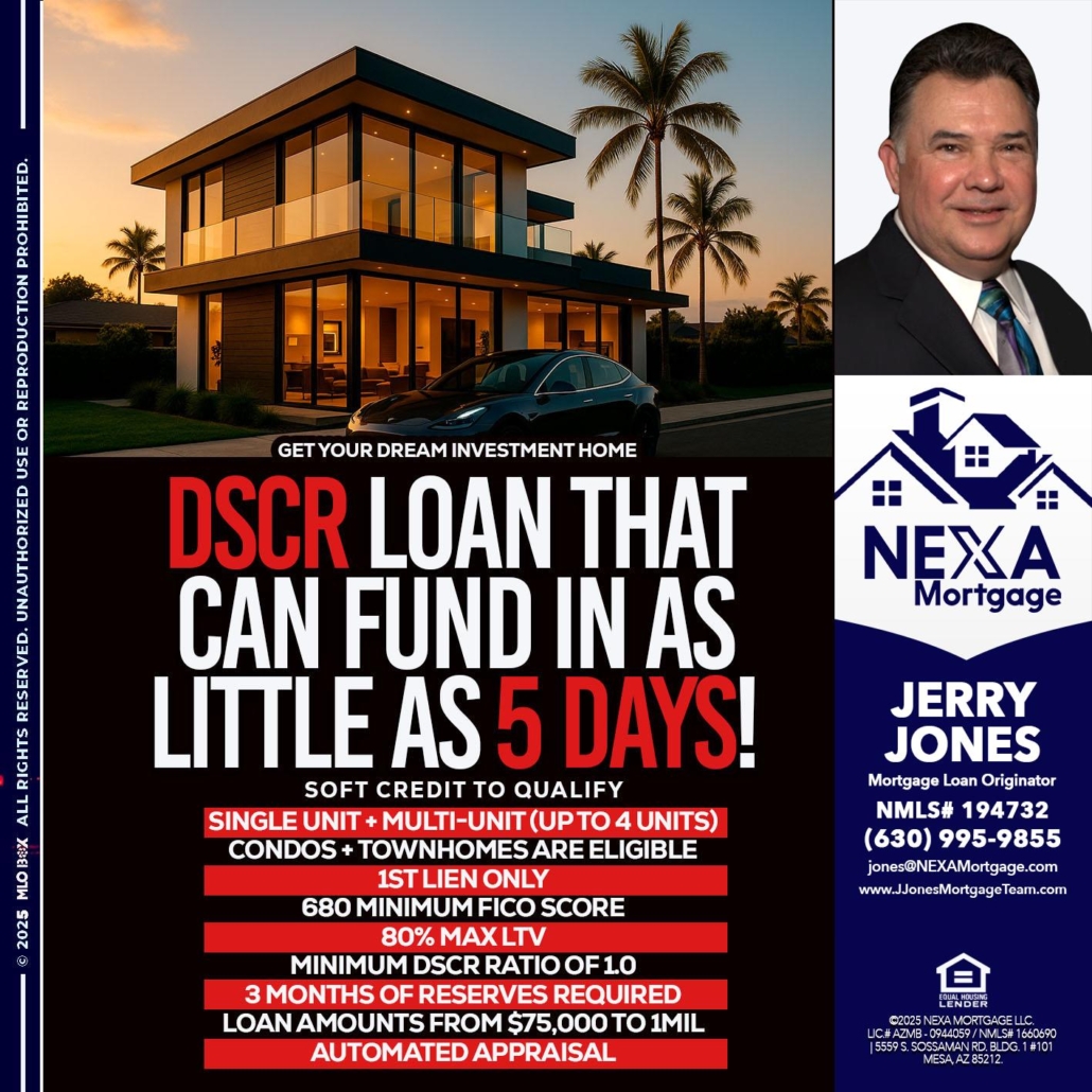 DSCR LOAN - Jerry Jones -Mortgage Loan OriginatorHi, my name is Jerry Jones. I’m a Loan Officer with NEXA Mortgage LLC, offering personalized mortgage solutions, fast customized quotes, great rates and service with integrity.