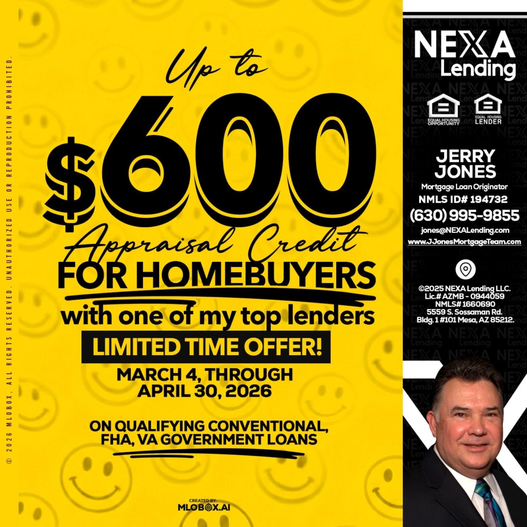 UP TO 600 - Jerry Jones -Mortgage Loan OriginatorHi, my name is Jerry Jones. I’m a Loan Officer with NEXA Lending LLC., offering personalized mortgage solutions, fast customized quotes, great rates and service with integrity.